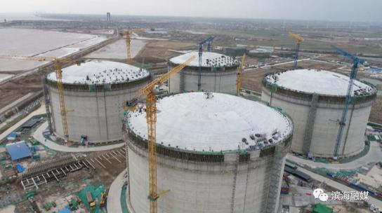 日前,记者在中海油江苏滨海LNG接收站项目建设现场看到,储罐区的4座LNG储罐已经完成外罐顶的混凝土浇筑。工作人员正在加快工艺厂和厂前区工程建设进度。