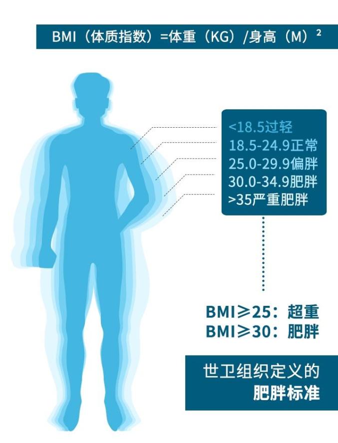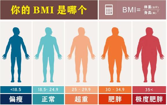 目前临床用BMI来评价肥胖程度:BMI<18.5者为体重过低,18.5~23.9为正常范围,BMI≥25为超重;BMI≥30为肥胖。