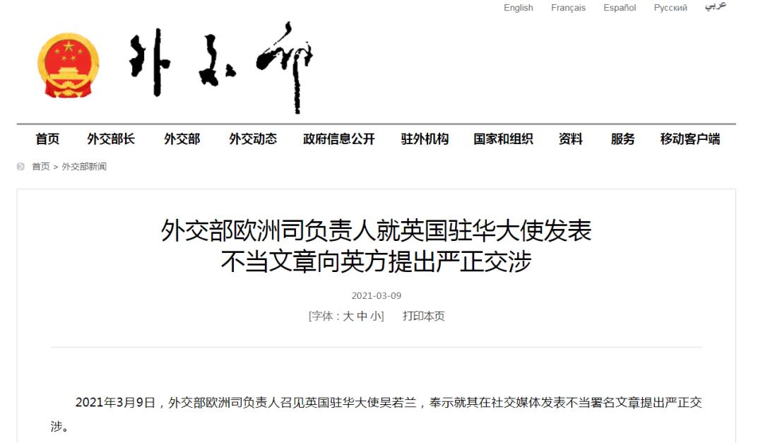 据外交部网站消息,3月9日,外交部欧洲司负责人召见英国驻华大使吴若兰,奉示就其在社交媒体发表不当署名文章提出严正交涉。