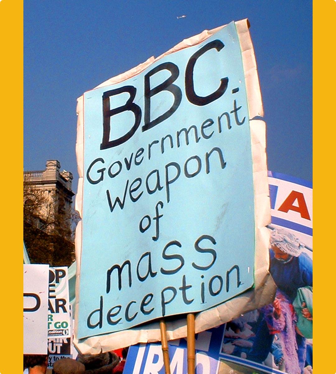 伊拉克战争后海外民众游行谴责BBC是“(英国)政府大规模欺骗性武器”BBC等西方媒体的报道则是“两不”——不服务中国社会,不造福中国人民。恰恰相反,BBC的涉华热点报道有一套自己预设的议题和剧本。从疫情到人权,从香港到新疆,BBC在报道框架中反复使用“威权”“专制”“镇压”等在英文语境中极为负面的词汇来为中国“下定义”,甚至使用“集中营”“种族灭绝”等耸人听闻的奇谈怪论来哗众取宠。