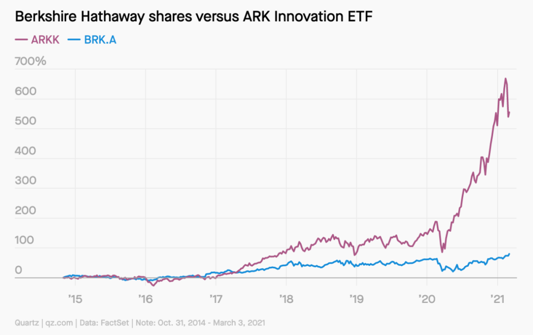 但自2014年10月创立以来,伍德管理的明星基金产品ARKK——主动管理型开放式指数基金(ARK Innovation ETF)涨幅已经超过500%,而伯克希尔的A类股仅涨了约80%。