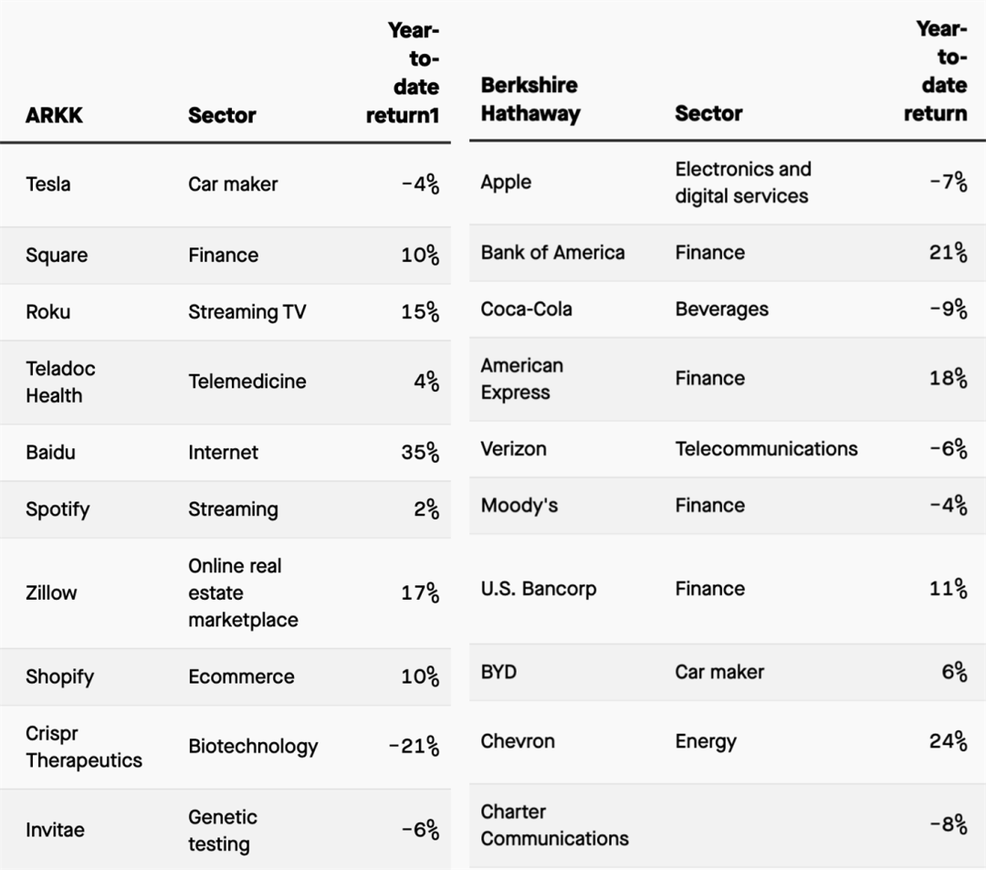 图为ARKK和BRK.A分别持仓的10支普通股股票