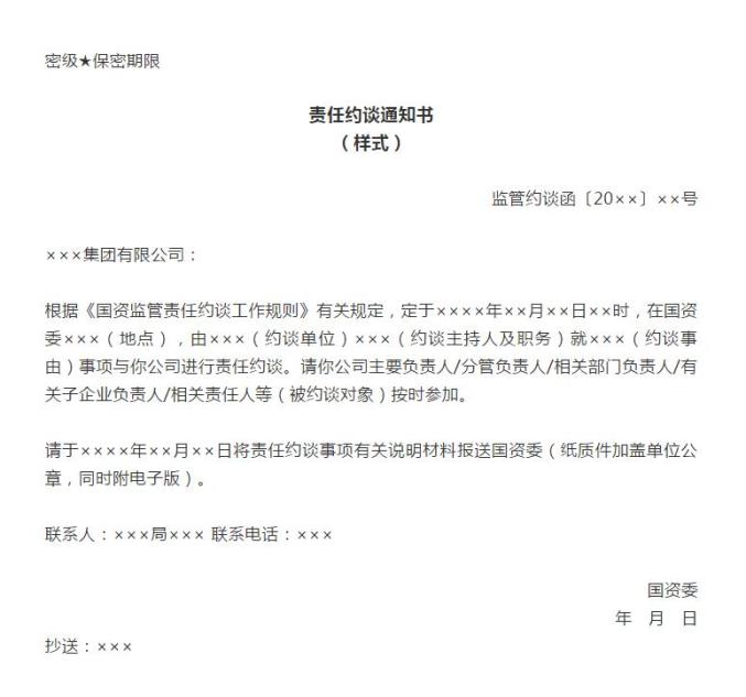 第四条 出现第三条所列责任约谈情形的,国资委相关厅局根据职责启动责任约谈工作,拟制《责任约谈通知书》,报经国资委分管负责同志审签同意后,以国资委名义印发被约谈中央企业,根据需要抄送国资委责任追究机构、有关纪检监察机构、组织人事部门、巡视机构等。
