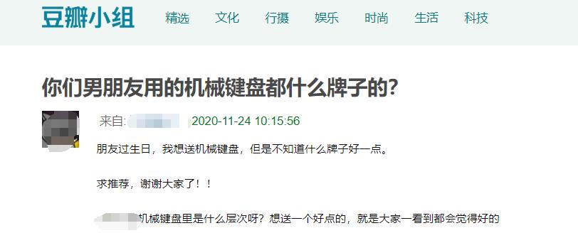 不知道从什么时候开始,机械键盘成了女孩子送男友的一个重要礼物,在豆瓣小组上,小姐姐们“求推荐”键盘品牌的贴子比比皆是。