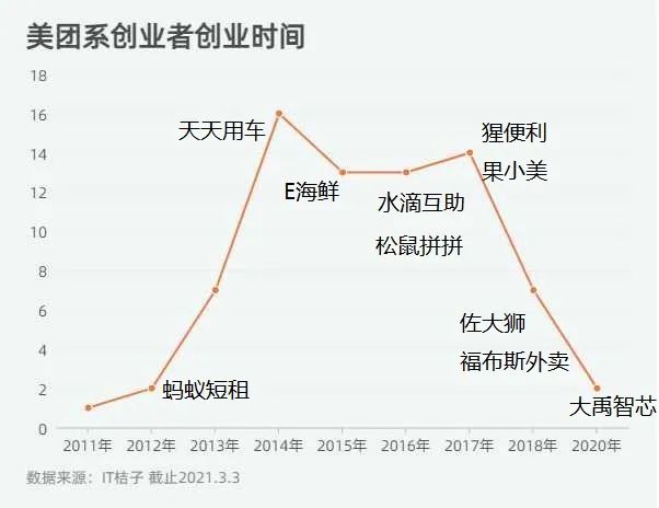 IT 桔子数据显示,2014 到 2017 年是美团系创业者出来开公司最为高频的时段,那几年每年平均有 14 位美团员工或者管理层出来创业。