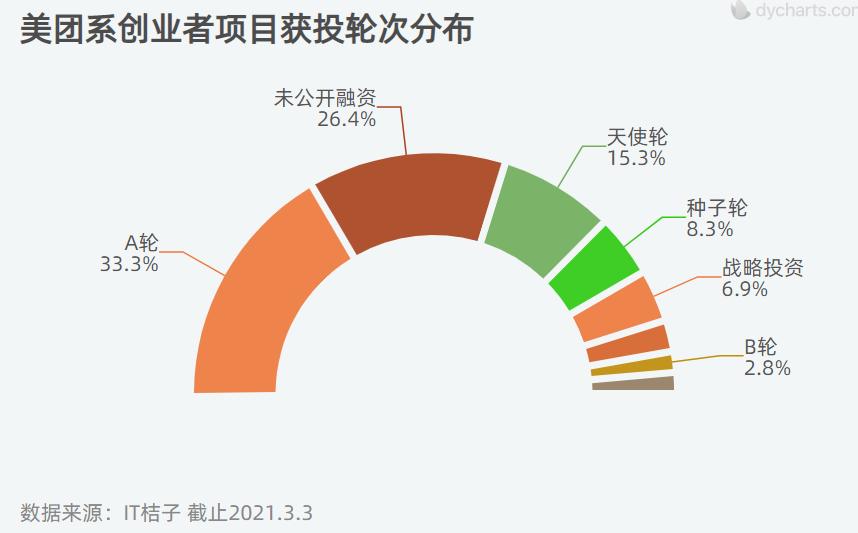 IT 桔子数据显示,美团系创业者的创业项目获投率达到了 74% 左右。获投资的公司大多还处于早期阶段,其中 33% 正处于 A 轮,24% 处于天使/种子轮,获得 B 轮及之后的不到 10%。