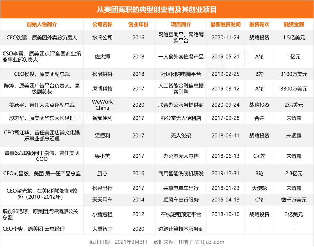 根据 IT 桔子统计,从美团离职后,在创业公司担任创始团队核心人员的共有 75 人,以下统称其为「美团系创业者」。