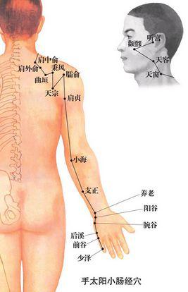 “对照经络图,小王肩胛骨中间痛点是天宗穴,手臂与身体连接处上1寸痛点是肩贞穴,这2个地方也是小肠经常见拥堵点。把天宗穴和肩贞穴的痛点揉开,拔罐、艾灸等都可以,平时常揉揉后溪穴,或者用桌子边等较尖锐的角摩擦刺激这个小肠经重要穴位。小肠经管小肠,管消化吸收,小肠募关元,好比它的充电开关插座在关元,肚脐眼下四横指,低腰露脐装不要再穿啦!”小王:“低腰露脐装还好我没有,否则就浪费了!”