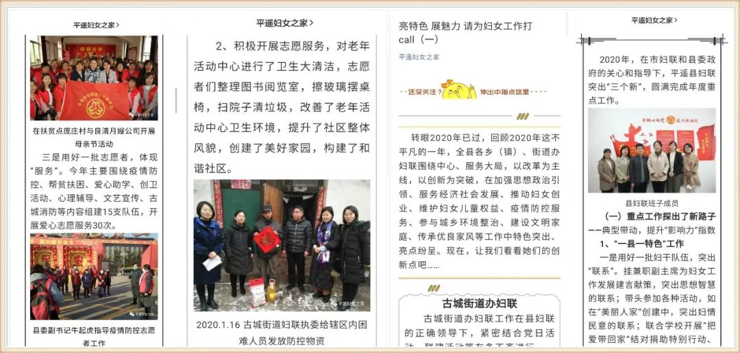 疫情防控巾帼赞,展现榜样力量。市、县妇联在微信公众平台开设了“疫情防控中沉在村落、街巷的‘妇联人’”“巾帼志愿担使命 疫情防控我出力”“抗疫巾帼赞”等栏目,发掘妇联系统、农村社区、医疗卫生、公安民警、社会组织等行业领域中涌现出的女性工作者100余名,对她们的感人事迹和动人故事进行大力宣传报道,弘扬社会正能量,展现巾帼勇担当。