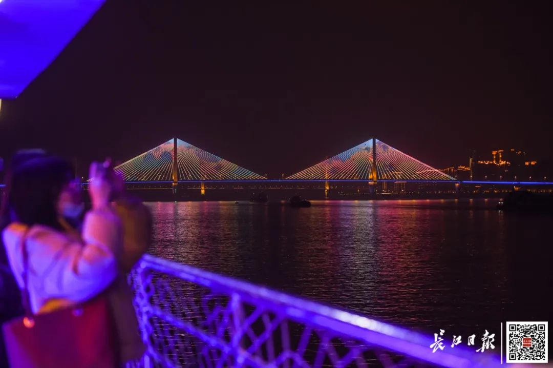 “武汉的夜晚太美了,好浪漫,粉了粉了!”来自河南信阳的付女士乘坐两江游览“东湖号”游船欣赏长江灯光秀,兴奋不已,不停和闺蜜拍照留念。为了满足游客夜晚泛舟万里长江的需求,汉口粤汉码头、汉口武汉关2号码头(苗家码头)、汉口王家巷码头、武昌中华路2号码头(黄鹤楼码头)、武昌中华路4号码头(红巷码头)等码头都有夜游航线运营,两江游览共10艘游船供游客夜游长江,19:00—20:30之间游船滚动发班。