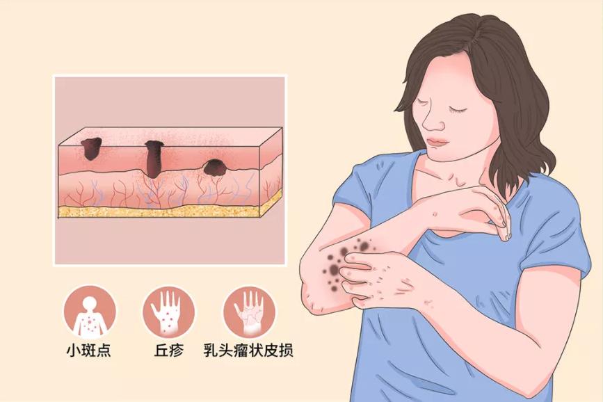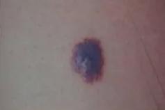 淡棕色至黑色斑块或轻度隆起的丘疹。可发生于皮肤、粘膜的任何部位,青春期后大多数交界痣转为皮内痣,有潜在恶变风险。
