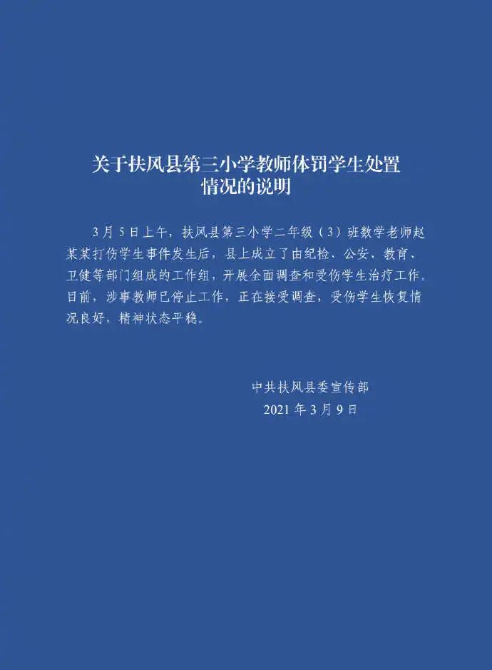 搜全国【学生做题漏单位被打涉事教师停职】5日,陕西宝鸡,杨女士称,因自己上小学二年级的孩子做题漏了一个单位,被数学老师用书本卷起来打眼睛和脸部,孩子险些失明。且事后该教师没有第一时间带孩子就医。扶风县委宣传部发布通报,涉事教师已停止工作,正接受调查,受伤学生恢复情况良好,精神状态平稳。