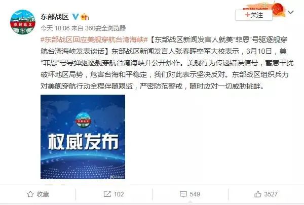 【东部战区发声!】东部战区新闻发言人张春晖空军大校表示,3月10日,美“菲恩”号导弹驱逐舰穿航台湾海峡并公开炒作。美舰行为传递错误信号,蓄意干扰破坏地区局势,危害台海和平稳定,我们对此表示坚决反对。东部战区组织兵力对美舰穿航行动全程伴随跟监,严密防范警戒,随时应对一切威胁挑衅。【点击查看】