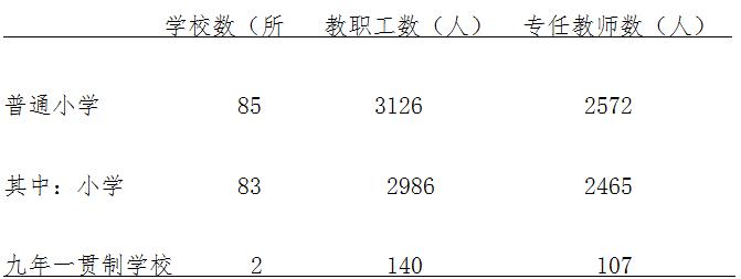全州共有小学83所,较上年增加1所,有小学教学点28个,较上年减少2个。小学招生9408人,比上年减少171人,同比下降1.8%。在校生55691人,比上年增加1874人,增长3.5%。毕业7486人,比上年减少12人,下降0.016%。小学学龄儿童净入学率达到99.3%。