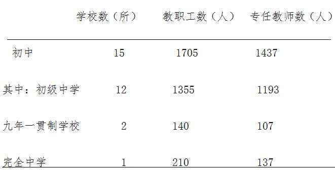 全州共有初中15所,其中初级中学12所,九年一贯制学校2所,完全中学1所,比上年增加2所,更改学校性质1所。2020年共招生6673人,比上年减少428人,下降6%;在校生22352人,比上年减少725人,下降3.1%;毕业生7302人,比上年增加938人,增长14.7%;初中阶段毛入学率108.2%,比上年同比减少5.3个百分点。