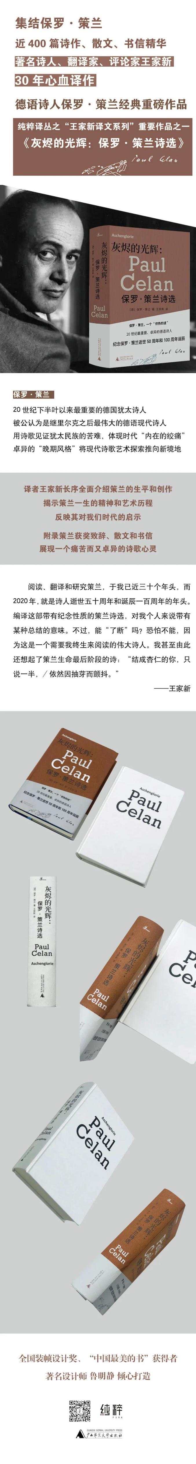 2021年1月,由著名诗人、翻译家、评论家,人大教授、博士生导师王家新历经30年阅读、翻译和研究策兰的经典心血译作《灰烬的光辉:保罗·策兰诗选》由广西师范大学出版社·纯粹出版。这本集保罗·策兰近400篇诗作、散文、书信精华的译著引领我们走进保罗·策兰的诗歌世界,也令我们更加深刻地体会到保罗·策兰对后世的影响。