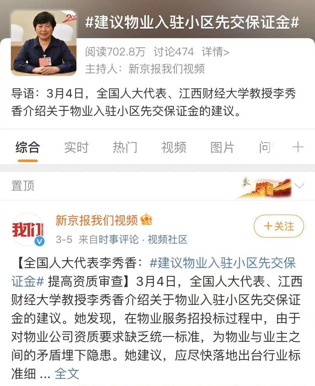 微博话题#建议物业入驻小区先交保证金#阅读量达到702.8万