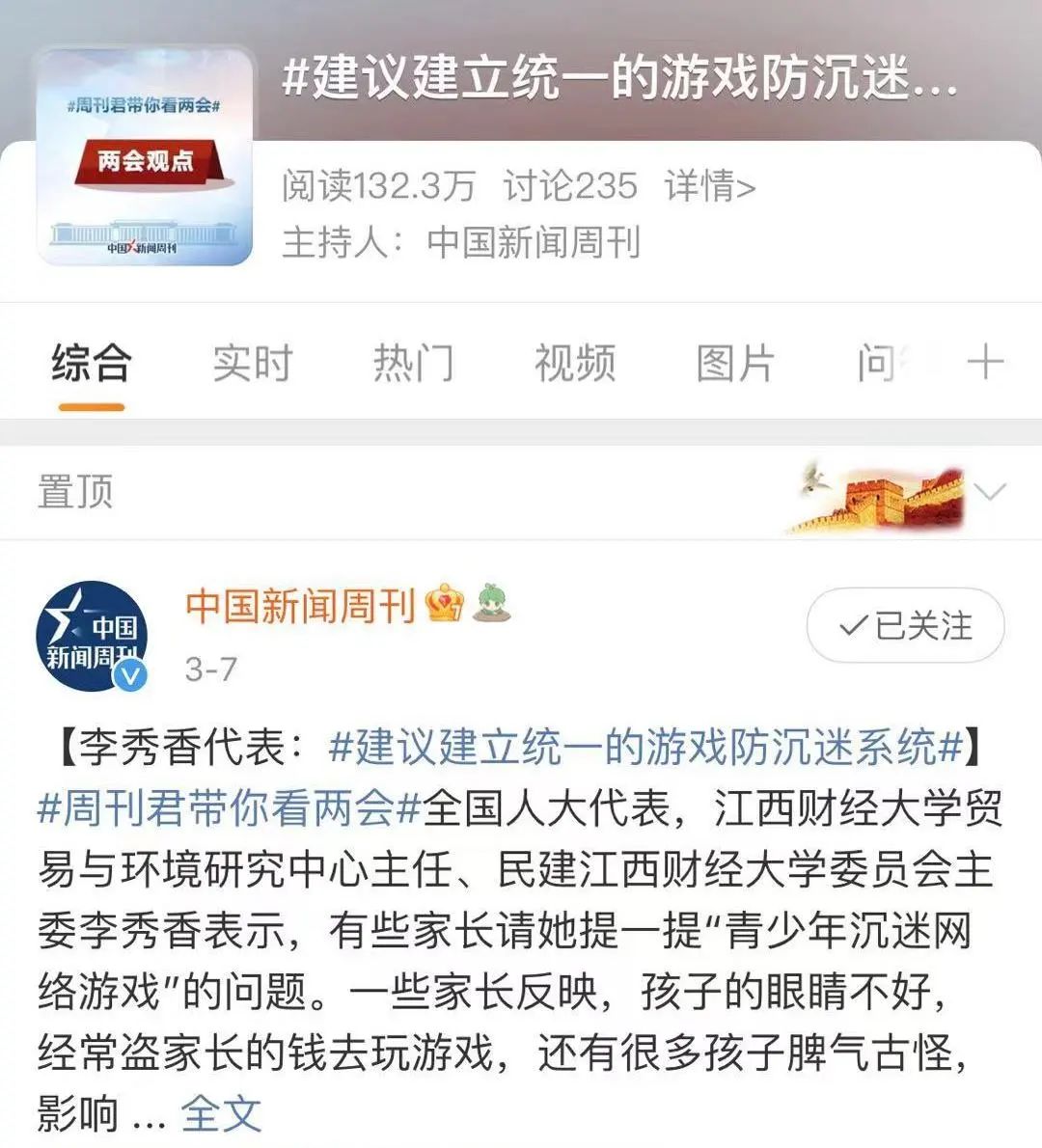 微博话题#建议建立统一的游戏防沉迷系统#阅读量达到132.3万