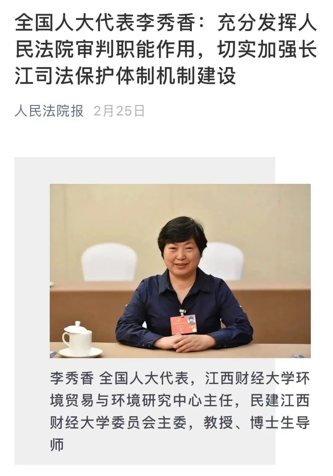 长江是中华民族的母亲河,以丰富的水资源哺育着沿岸四亿多人民。“《长江保护法》是我国首部有关流域保护的专门法律,具有创新意义,对其他流域立法在立法理念、制度设计等方面具有十分重要的借鉴意义。”李秀香谈及《关于贯彻