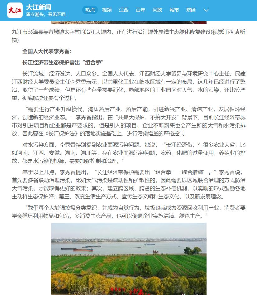 “以前重化工业在临水区域有一定的布局,这几年已经进行了整治,但是还有些存量需要消化,局部地区的工业园区对大气、水的污染,还比较严重,彻底解决还要有个过程。”李秀香建议,“长江经济带保护需要出‘组合拳’‘综合措施’。首先要多省联动治理污染,比如大气污染是流动性和扩散性的,因此需要以区域联合治理的方式防治大气污染,才能取得更好的效果;其次,建立跨区域、跨省的生态补偿机制,以奖励的形式鼓励各地主动将生态保护好;第三,改变生活生产方式,宣传生态文明和生态文化,以及新发展理念。”
