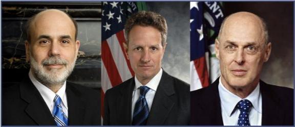 “救市三人组”:时任美联储主席伯南克(左)、纽约联邦储备银行行长盖特纳(中)、财政部长保尔森(右)伟大导师列宁有言,“有时候几十年里什么都没有发生,有时候几周里发生了几十年的事情。”对于参与处置美国金融危机的各方人士,尤其是监管者来说,观感与此无异。