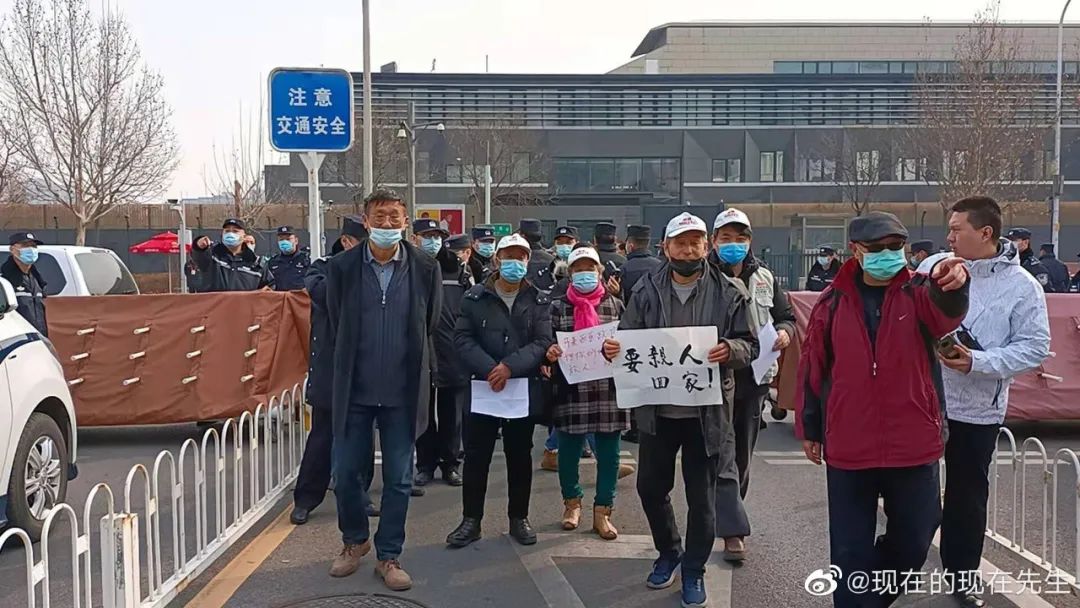 2021年3月8日,栗二有(左二)和其他失联者家属,在马来西亚驻华大使馆门前站在大使馆门前,家属们一如往常,把自己想说的写在白纸上,举在胸前,栗二有写的是:不要隐瞒,要公布真相。