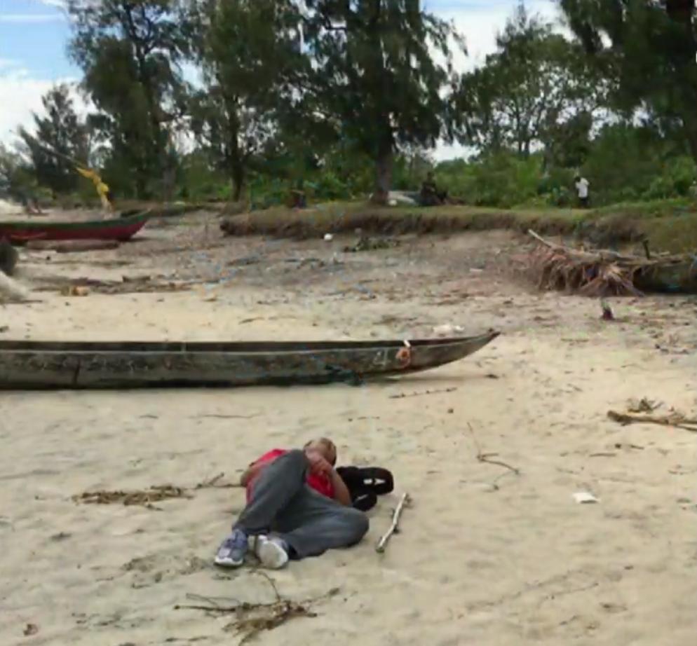 栗二有躺在沙滩上在一次跨岛搜索中,栗二有差点没能活下来。
