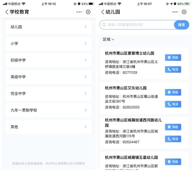 可以查找萧山区内的各类学校,并且提供导航以及拨打电话功能。