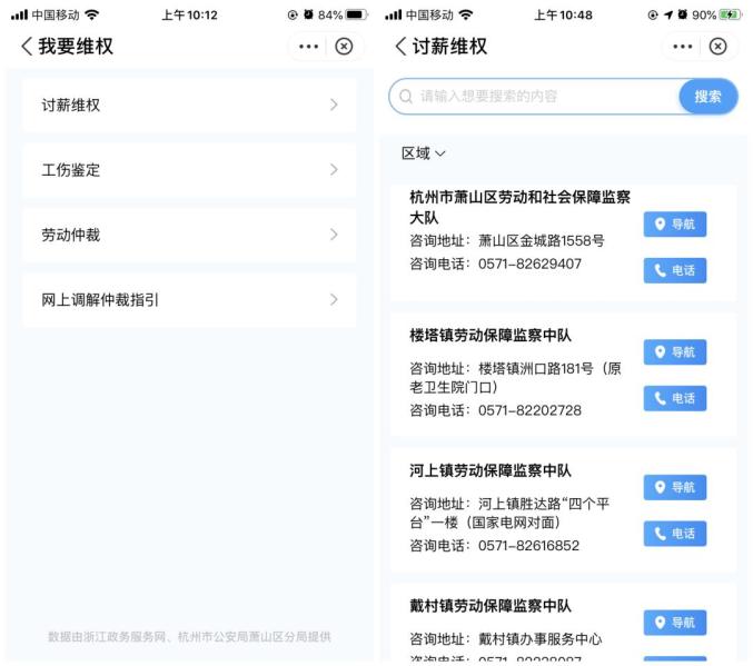 “我要维权”提供讨薪维权、工伤鉴定、劳动仲裁相关机构的联系方式以及相关申请流程须知以及表格,可以对地址进行导航并且拨打咨询电话。