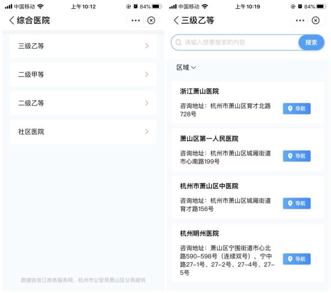 “综合医院”可以查找萧山区内的各级医院,并且提供导航功能。