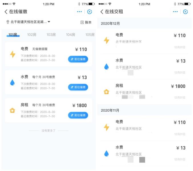 目前,钉管家支付宝以及钉钉端都已上线“在线催缴”“我的账单”模块,房东可以记录出租房屋的水费、电费、房租费用并设置催缴提醒,对应的租客可在我的账单模块查看相应账单,如果房东设置了催缴提醒,居住人可相应的收到缴费通知。