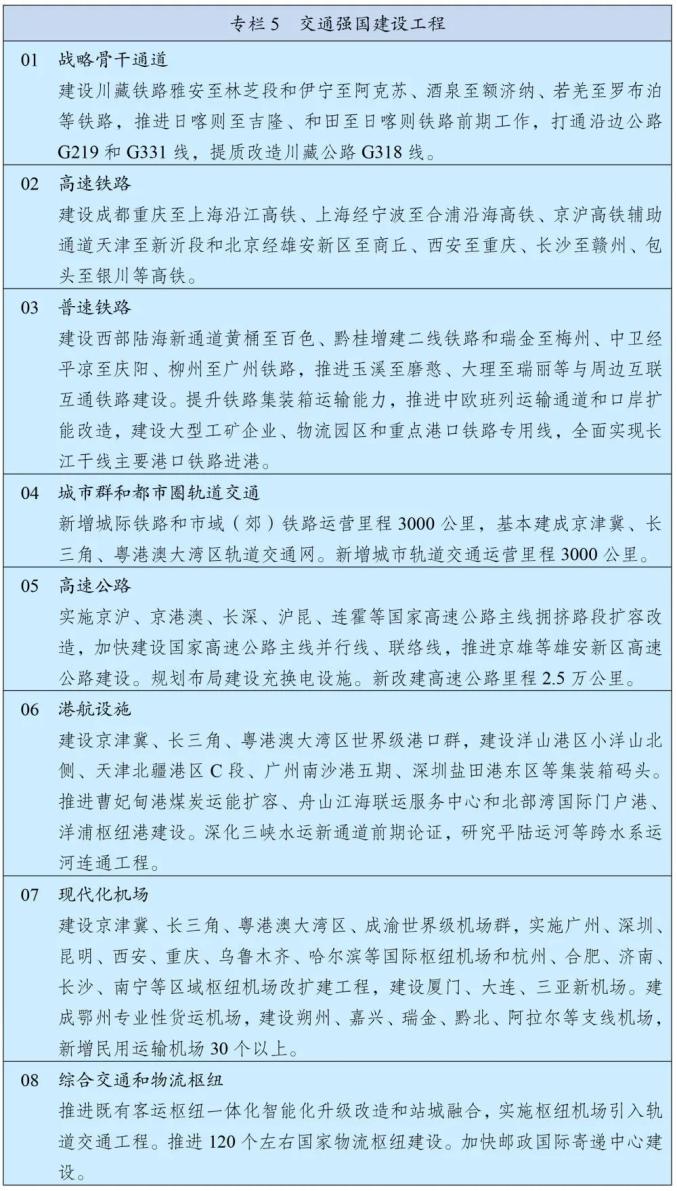 构建快速网,基本贯通“八纵八横”高速铁路,提升国家高速公路网络质量,加快建设世界级港口群和机场群。