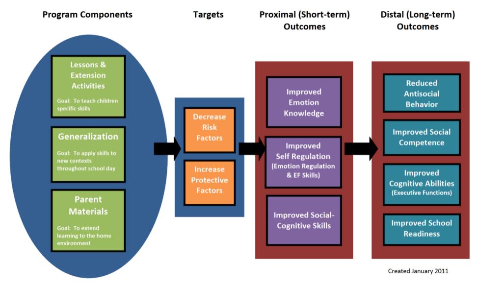 以授课形式展开,为学前/幼儿园儿童设计(logic model 图2),除了课程之外,教师还通过详细的拓展活动如小组游戏、艺术项目、书籍等进行干预。