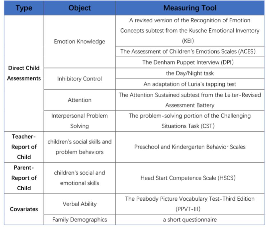根据测量对象的不同,可将测量分为对孩子、教师、父母的测量。对孩子主要从情绪知识、抑制控制、注意力、解决人际问题四个方面选用相关的量表和任务来进行测量,对教师的测量通过学前行为量表评估孩子的社交能力和问题行为,对父母的测量通过能力量表评估孩子的社交情感能力。此外,协变量的测量包括对孩子的言语能力测试和由主要照顾者填写的家庭人口结构问卷。如图3。