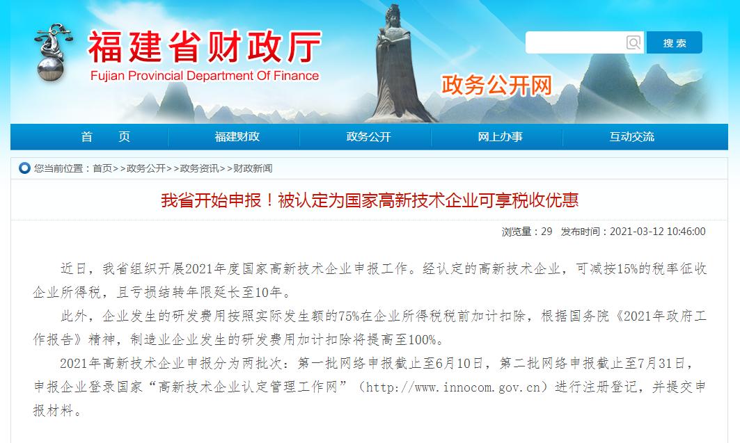 近日,我省组织开展2021年度国家高新技术企业申报工作。经认定的高新技术企业,可减按15%的税率征收企业所得税,且亏损结转年限延长至10年。此外,企业发生的研发费用按照实际发生额的75%在企业所得税税前加计扣除,根据国务院《2021年政府工作报告》精神,制造业企业发生的研发费用加计扣除将提高至100%。