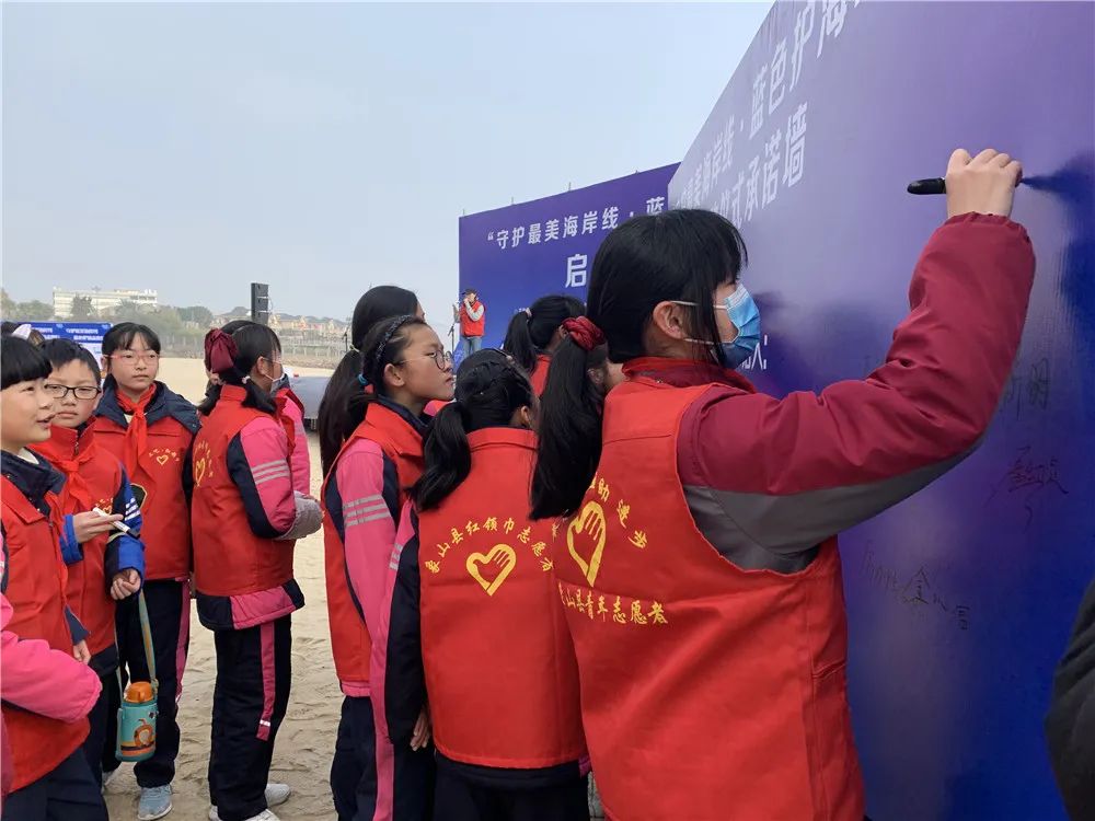 来自全县的170多名青年和小学生志愿者们在认真学习海洋环境保护和垃圾分类知识后,在爵溪东塘开展净滩行动。