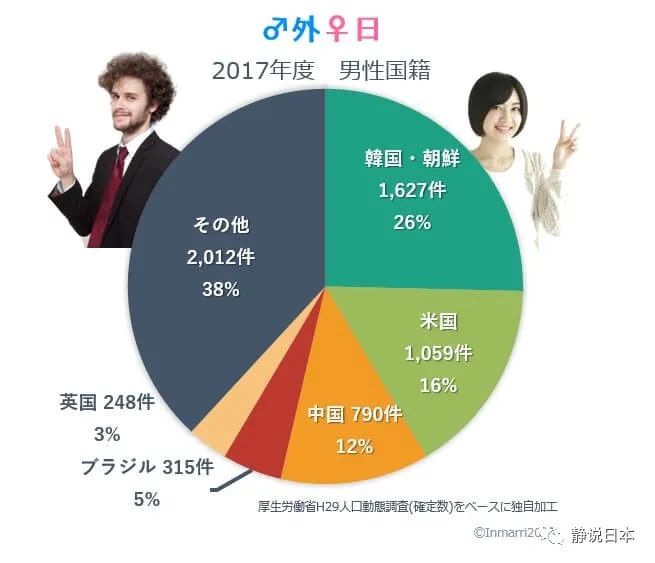 日本厚生劳动省的2017年调查数据显示,是12.5%,仅次于美国男人(16.7%),高于英国男人(3.9%)4到5倍。当然日本女性嫁的最多的是韩国、朝鲜国籍的男人,占到当年国际结婚总数的25.7%。