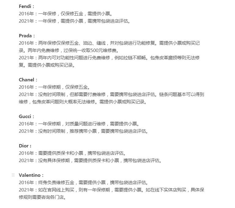 2016年,一篇媒体报道指出,部分奢侈品门店保修条件苛刻。“由于包袋的主体皮质部分是消耗品,很容易被磨损或变色,故不在保修范围,专柜也不提供包袋保养服务。拉链、扭锁等五金配件的保修仅限断裂等严重质量问题,正常使用造成的五金褪色无法保修。”