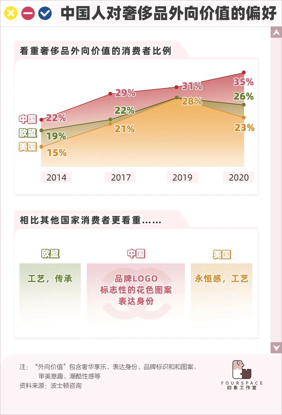 波士顿咨询咨询的报告显示,中国的奢侈品消费者相较于美国和欧盟,更注重品牌的LOGO和标志性的花色图案。奢侈品对于中国的消费者而言,更多是一种身份的象征。