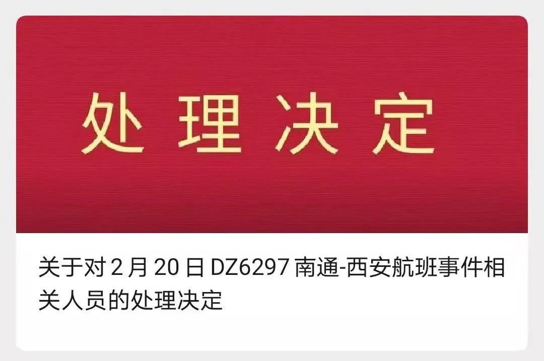 3月15日,东海航空发布关于对2月20日DZ6297南通-西安航班事件相关人员的处理决定。