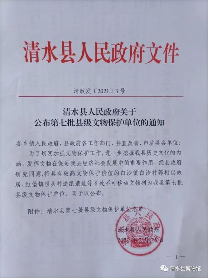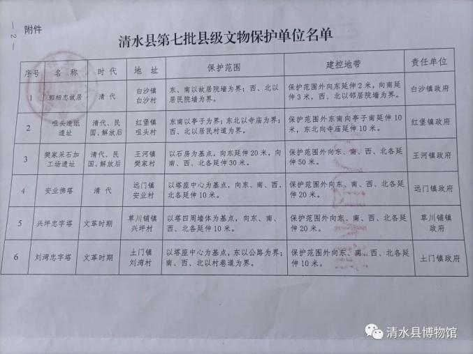 为了切实加强文物保护工作,着力打造以轩辕文化为龙头的清水特色文化,进一步挖掘我县历史文化的内涵,发挥文物在促进我县经济社会发展中的重要作用,2021年2月经县政府常务会议审议,同意将具有较高文物保护价值的白沙镇白沙村郭相忠故居、红堡镇咀头村造纸遗址、王河镇樊家采石加工场遗址、远门镇安业佛塔、草川铺镇兴坪忠字塔、土门镇刘湾忠字塔6处不可移动文物列为我县第七批县级文物保护单位。
