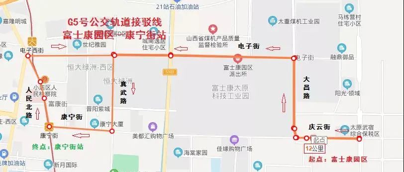 G5路公交车由富士康园区开往康宁街地铁站,具体站点为富士康园区、电子街唐槐路口、电子街、电子街坞城南路口、真武路电子西街口、真武路富康街口、小店村、康宁街地铁站。