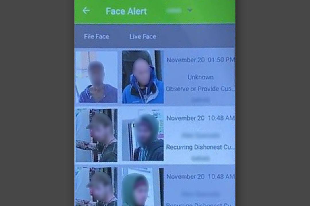 摄像头会为进入店铺的顾客建立一个独特的面部轮廓,然后与数据库中有嫌疑、甚至有前科的人脸进行「特征匹配」。发现可疑分子时,系统会对安全专员手机发出警报,专员在判断比对准确性后,决定是否要求该客户离开。