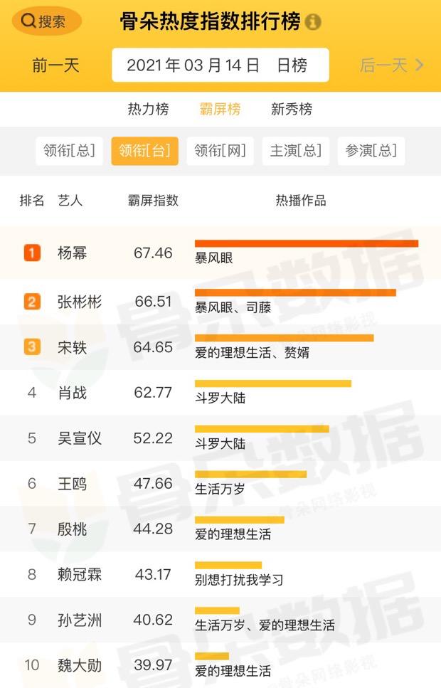 其主演杨幂、张彬彬两位主演也在艺人霸屏榜单前两位。在今天刚刚公布的中国视听大数据中,《暴风眼》的收视率是卫视排名中的第一和第二名。