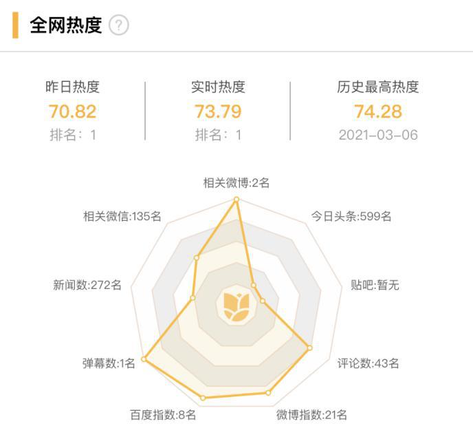 骨朵截取了3月15日《暴风眼》在播期间的全网热度雷达数据来看,该剧在昨日热度和实时热度均为第1名,《暴风眼》拥有着不错的传播度。
