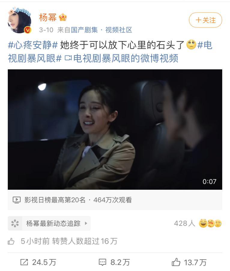 其中#心疼安静#的微博话题在主演杨幂的微博获得24.5万转发,8.2万的评论和13.7万的点赞。当安静得知父亲真正的死因后,平日里在工作上雷厉风行的她忍不住哭了,这对她来说既是伤痛也是安慰,家庭破碎与工作艰辛的双重伤痕都在安静这一人物身上展现的淋漓尽致,杨幂动情的演技也得到了网友的认可。