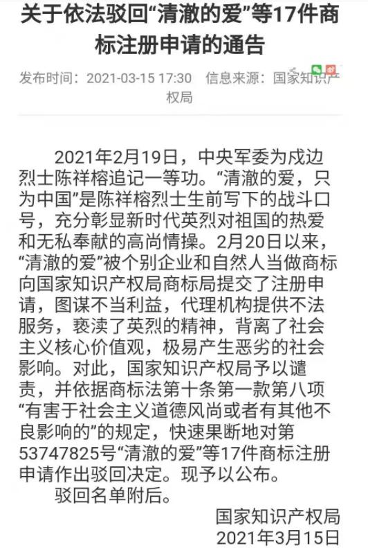 3月15日下午,国家知识产权局公布《关于依法驳回“清澈的爱”等17件商标注册申请的通告》。