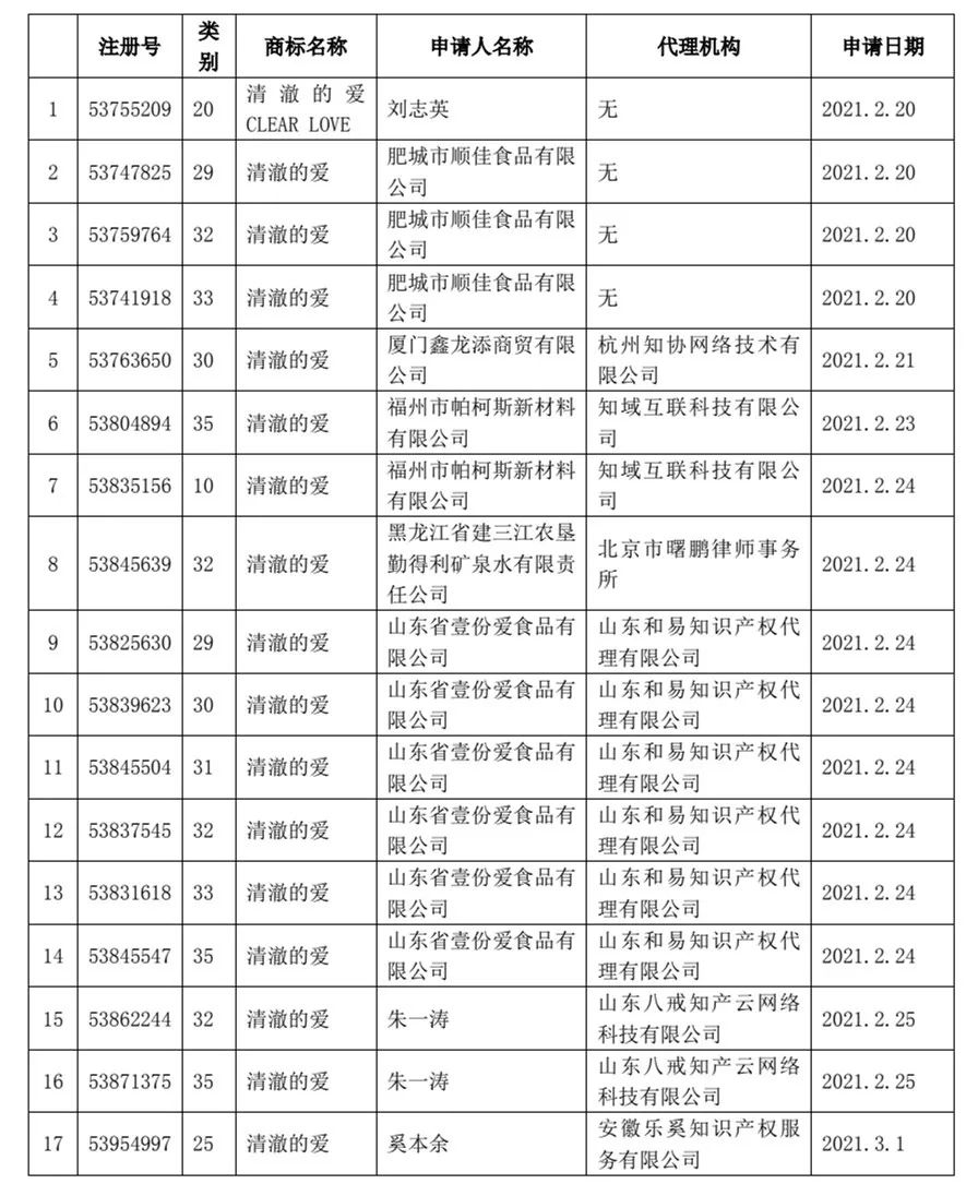在17件“清澈的爱”相关申请商标中,山东省壹份爱食品有限公司共申请6件“清澈的爱”商标,涉及食品、啤酒饮料、广告销售、饲料种籽等类别。