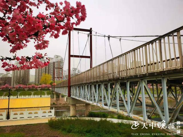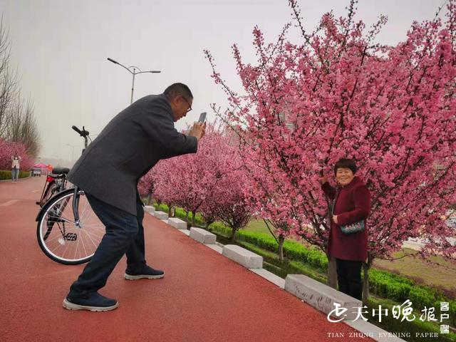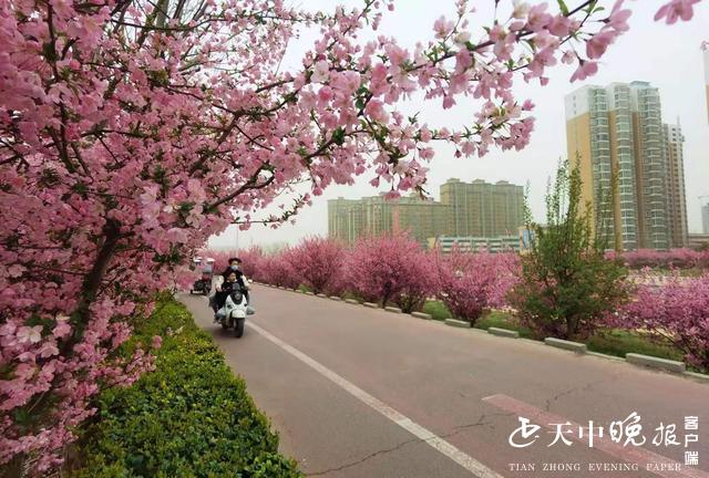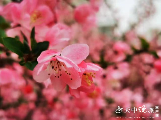 走进洪河岸边,一排排海棠沿着弯弯长长的河道伸延,粉粉的云霞一片。树枝上的粉红色的花朵随风摇曳,花朵中间衬映着透着晶莹的绿叶儿,显得清新、婉约、俏皮……春风吹拂,柔蔓袅袅,似乎能听到海棠花们细细碎碎的曼妙花语。