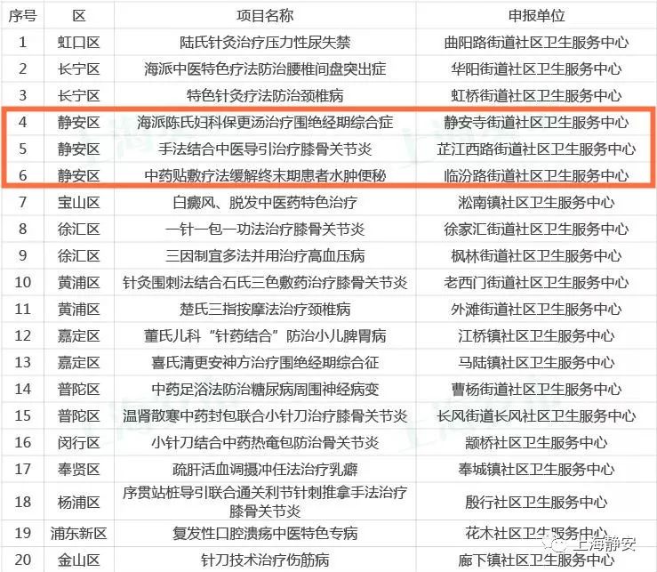 日前,经市卫生健康委、市中医药管理局对全市48个申报项目进行专家评审,最终20项上海市社区中医特色诊疗服务品牌脱颖而出。其中,静安区卫生健康委有3个项目入围,分别是:静安寺街道社区卫生服务中心项目